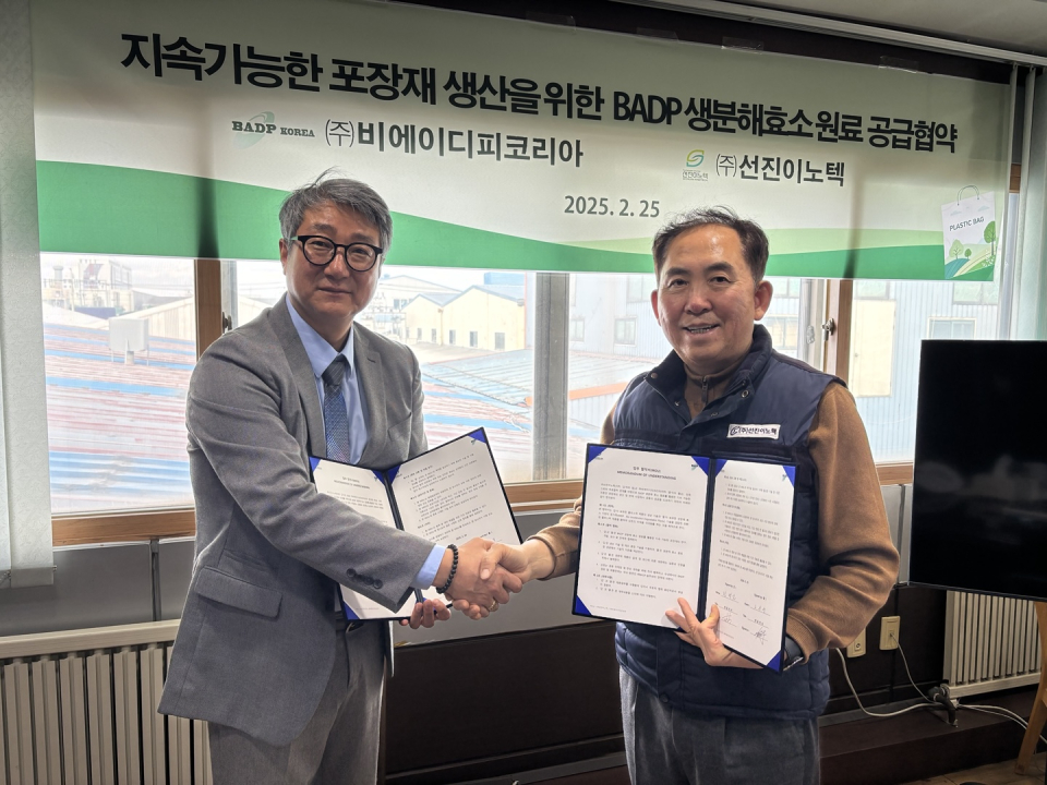 ㈜선진이노텍과 ㈜BADP코리아는 지난 25일 선진이노텍 본사에서 BADP 생분해 효소 원료를 활용한 포장재의 연구, 개발, 생산 및 판매를 위한 업무협약(MOU)을 체결했다.